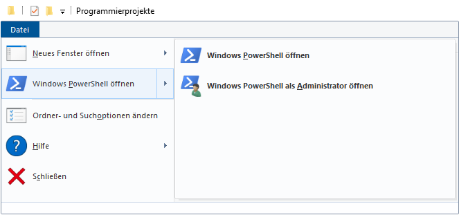 Sie benötigen Git (siehe oben). Allerdings deutet diese Fehlermeldung darauf hin, dass Sie die normale Konsole und nicht die Powershell benutzen. Die PowerShell können Sie starten, indem Sie den gewünschten Ordner öffnen und dann links oben auf Datei -> Windows PowerShell klicken: